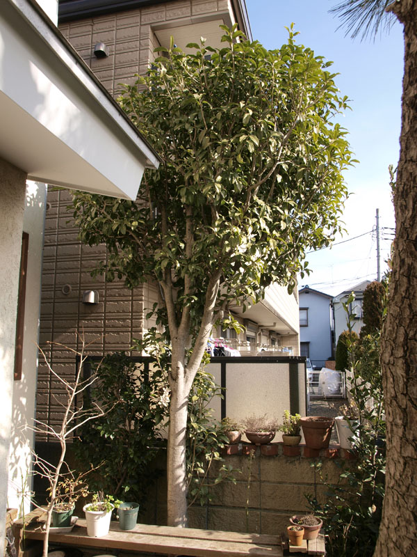 現在では、この木に巻き付くよう植えられたジャスミン(花期が長い)が樹幹部まで駆け上がって花を咲かせているので、1年を通じて長い間、花の香りが楽しめる。ジャスミンは当初、フェンスに絡ませるなど試行錯誤して育てていたが、いまひとつ良い状態にすることができなかった。マラケシュを訪れた際に、リヤドの中庭で、高木に駆け上がったジャスミンが木の高い所から垂れ下がり、活き活きと花を付けているのを見て、これを真似してみたところ、ジャスミンはこれまで思いもしなかったほど活き活きと成長した。宿主となったキンモクセイにはなんらマイナスの影響は見られない。リヤドで見たものもそうであったが、ジャスミンは巻き付いた木に悪影響を与えることはほとんどないように思われる。