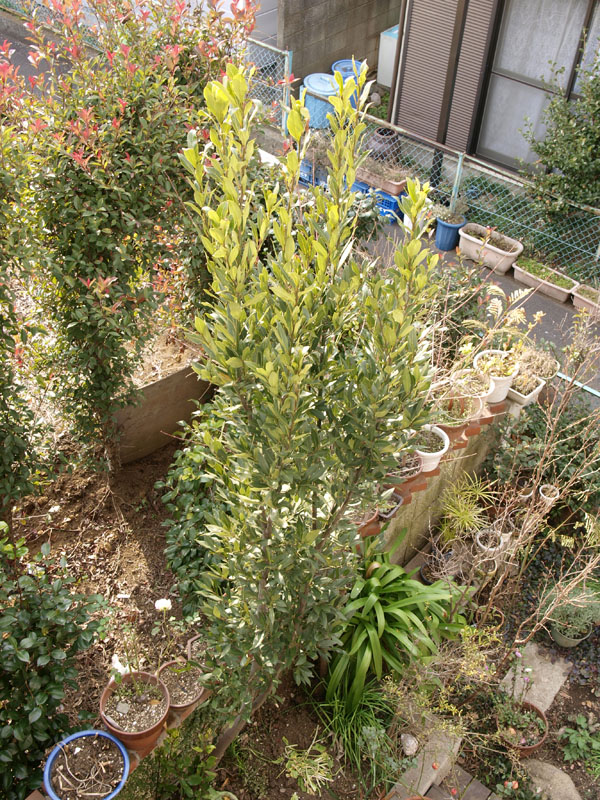 現在では、この木に巻き付くよう植えられたジャスミン(花期が長い)が樹幹部まで駆け上がって花を咲かせているので、1年を通じて長い間、花の香りが楽しめる。ジャスミンは当初、フェンスに絡ませるなど試行錯誤して育てていたが、いまひとつ良い状態にすることができなかった。マラケシュを訪れた際に、リヤドの中庭で、高木に駆け上がったジャスミンが木の高い所から垂れ下がり、活き活きと花を付けているのを見て、これを真似してみたところ、ジャスミンはこれまで思いもしなかったほど活き活きと成長した。宿主となったキンモクセイにはなんらマイナスの影響は見られない。リヤドで見たものもそうであったが、ジャスミンは巻き付いた木に悪影響を与えることはほとんどないように思われる。